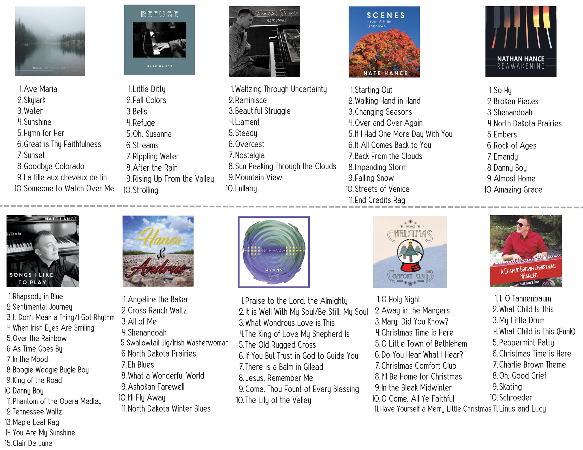 Dive into more than a decade of music with Nate Hance’s Complete Piano Collection, a 9-CD anthology capturing every era of his musical journey from 2014–2025. These albums reflect thousands of performances, countless hours at the piano, and a lifelong love of creating music that brings comfort, joy, energy, and imagination to listeners of all ages.